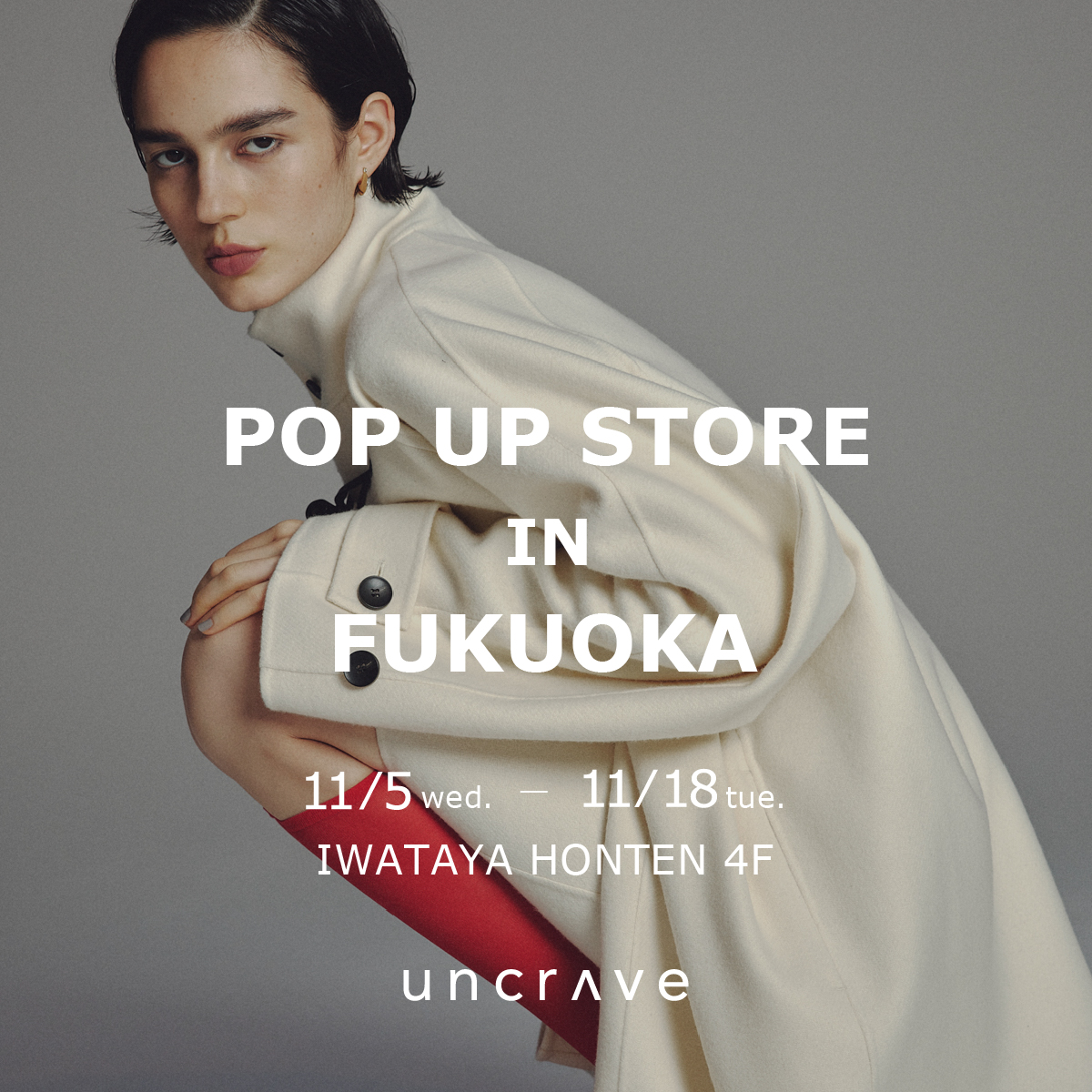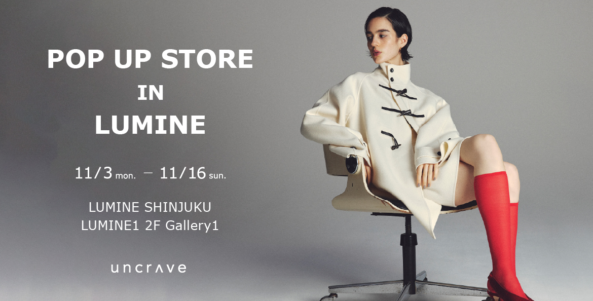 Close 11/3(月・祝)-11/16(日)の期間、新宿ルミネ1F イベントスペースにて、uncrave 単独 POP UP STOREを開催中 11/3から販売開始した新作も豊富に取り揃えております。皆様のご来店お待ちしております。