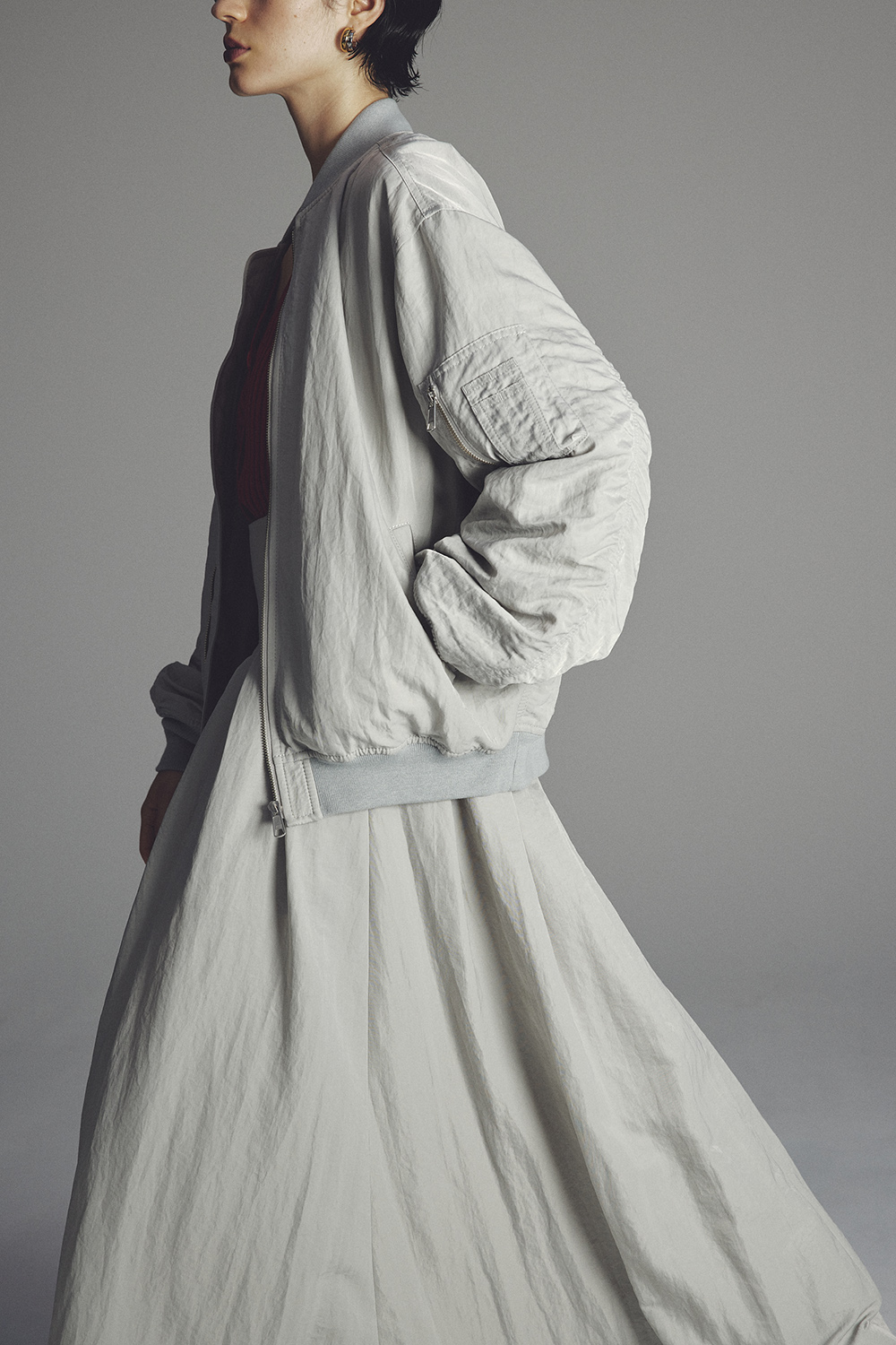 “ヴィンテージタフタ”は自然なシワ感が魅力。MA-1とフレアスカートは即戦力です。